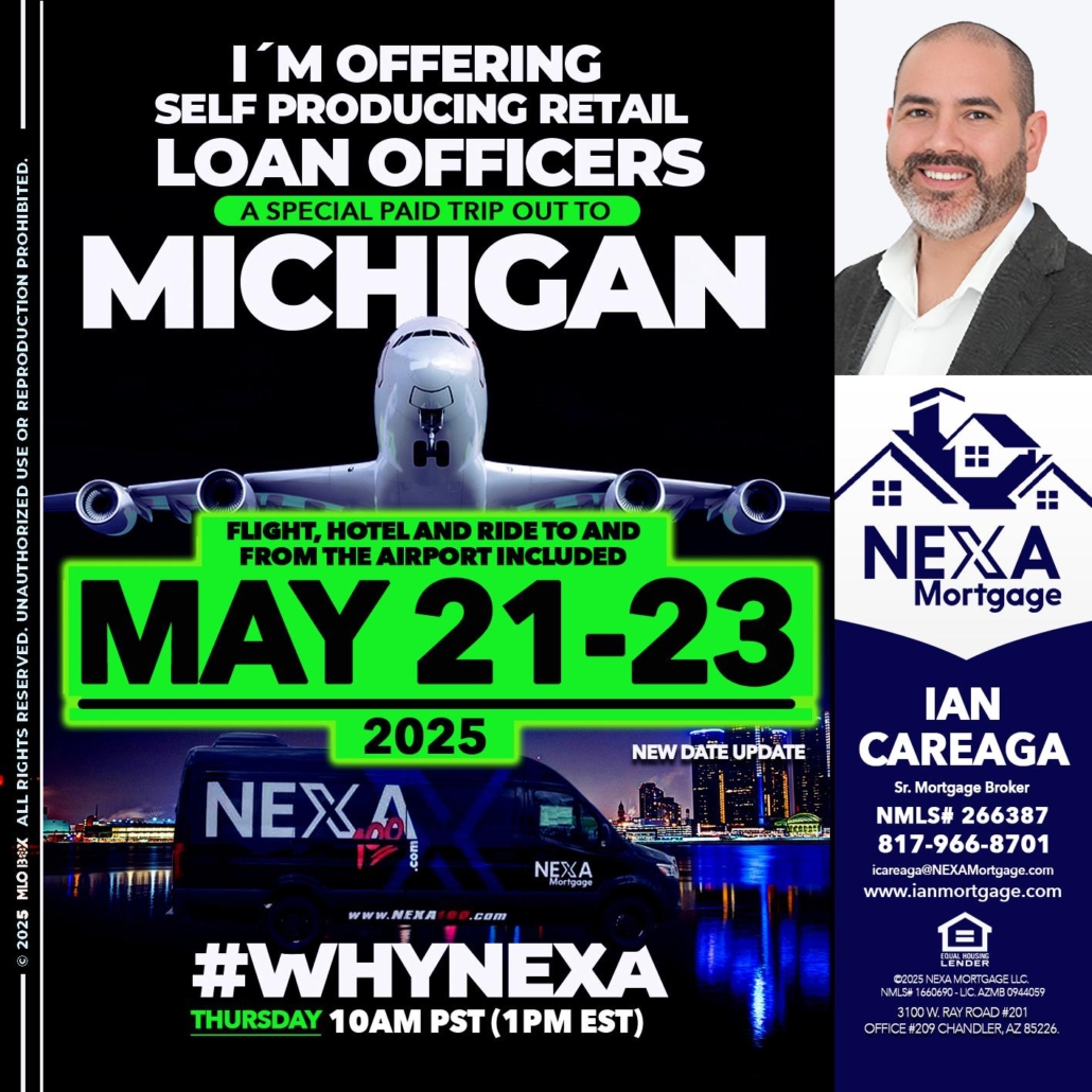 MICHIGAN TRIP - Ian Careaga -Sr. Mortgage BrokerHi, my name is Ian Careaga. I’m a Loan Officer with NEXA Mortgage LLC., offering personalized mortgage solutions, fast customized quotes, great rates and service with integrity.