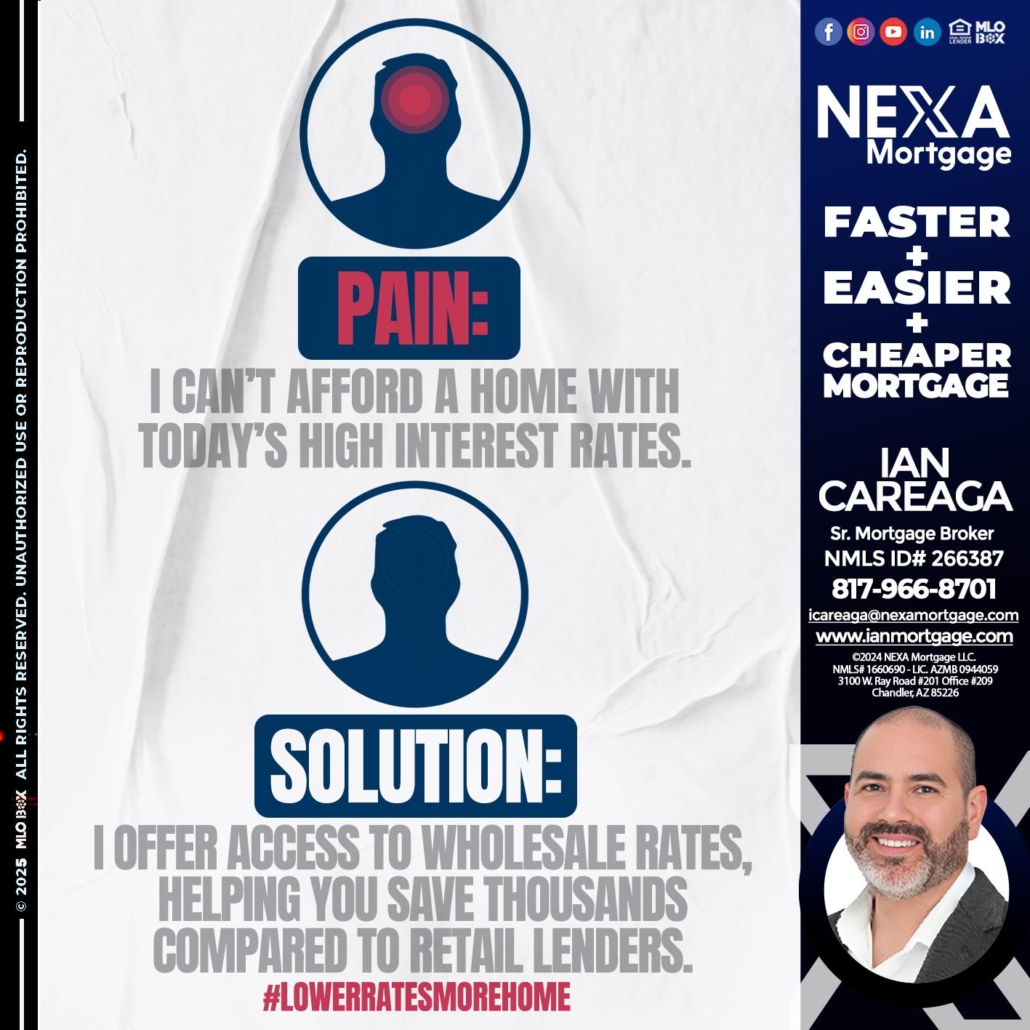 Hi, my name is Ian Careaga. I’m a Loan Officer with NEXA Mortgage LLC., offering personalized mortgage solutions, fast customized quotes, great rates and service with integrity.