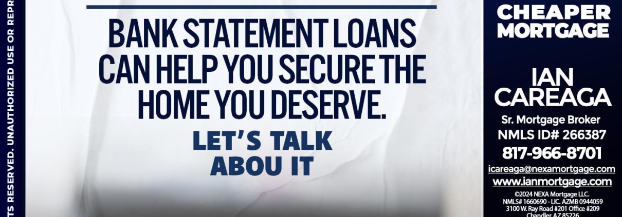 SELF EMPLOYED - Ian Careaga -Sr. Mortgage BrokerHi, my name is Ian Careaga. I’m a Loan Officer with NEXA Mortgage LLC., offering personalized mortgage solutions, fast customized quotes, great rates and service with integrity.