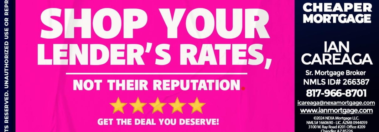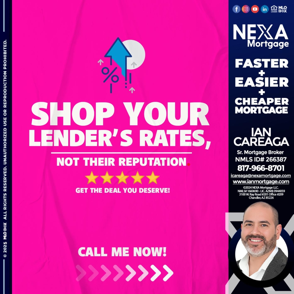 SHOP YOUR - Ian Careaga -Sr. Mortgage BrokerHi, my name is Ian Careaga. I’m a Loan Officer with NEXA Mortgage LLC., offering personalized mortgage solutions, fast customized quotes, great rates and service with integrity.